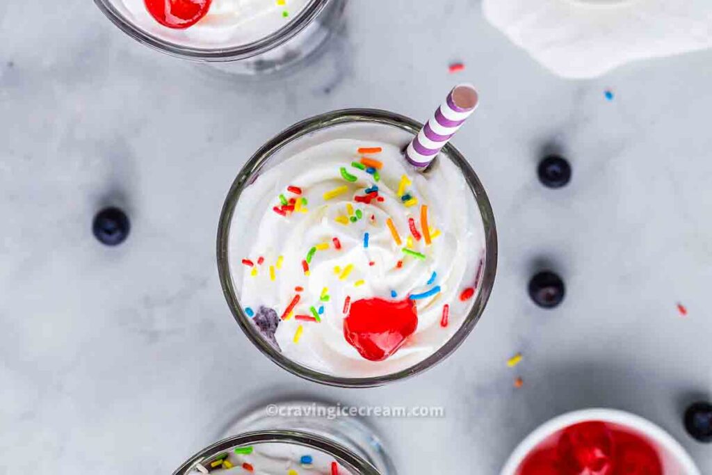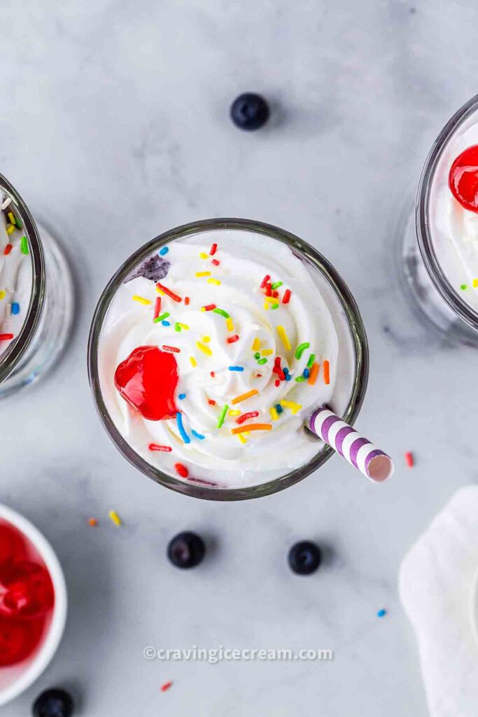 - Top with whipped cream, a maraschino cherry, and a few sprinkles for fun.