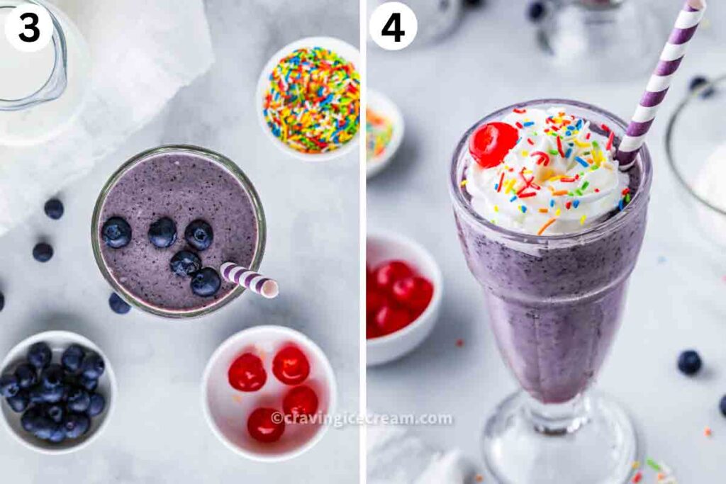 3. Serve immediately: Pour into a tall glass, top with whipped cream, and garnish with more blueberries.