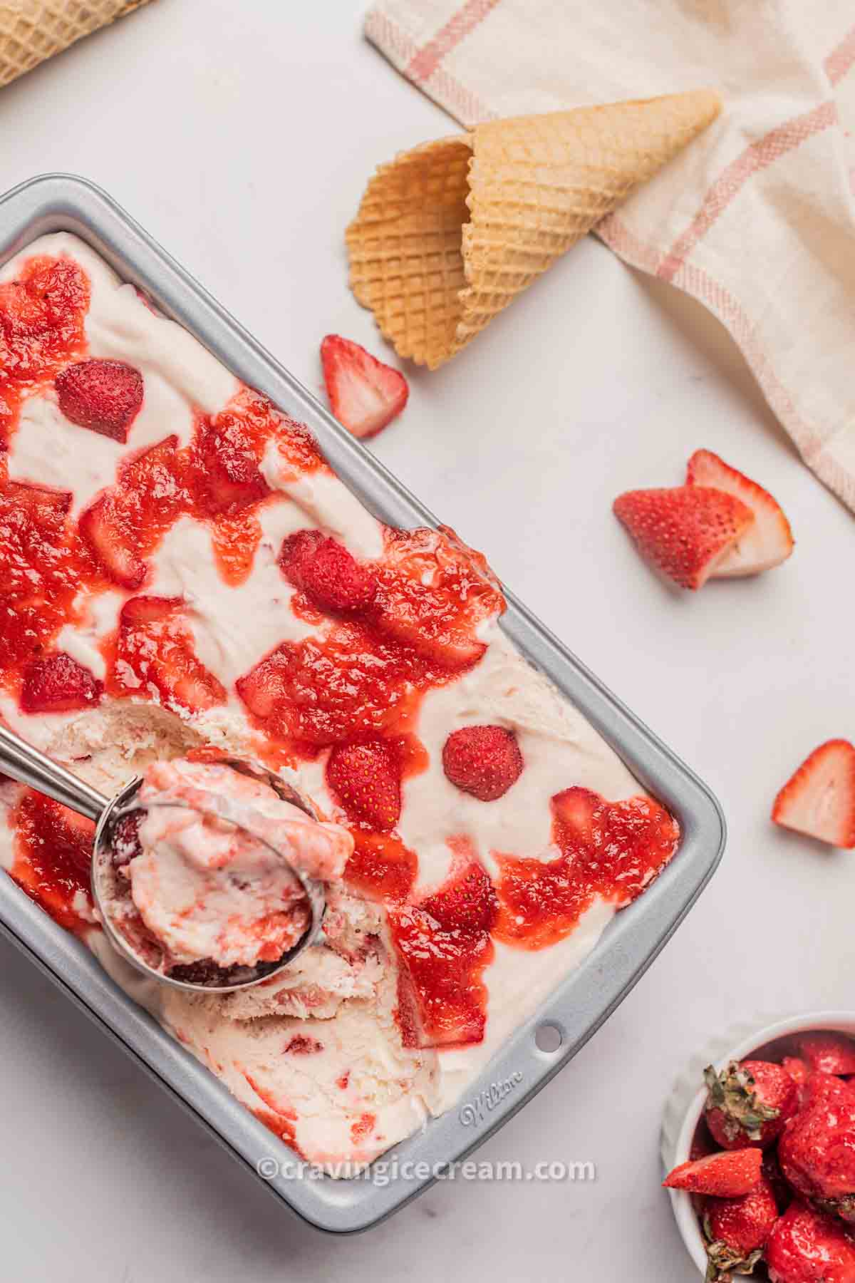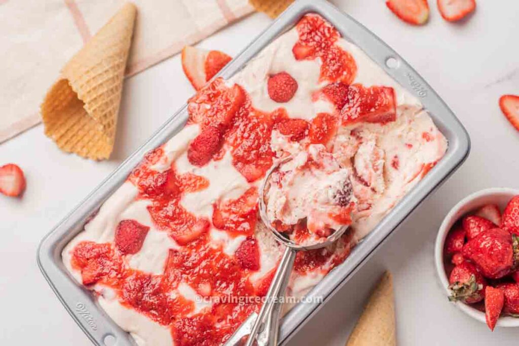 Made with simple ingredients, this recipe creates a refreshing scoop that bursts with strawberry flavor thanks to the amazing homemade strawberry sauce used in this recipe.