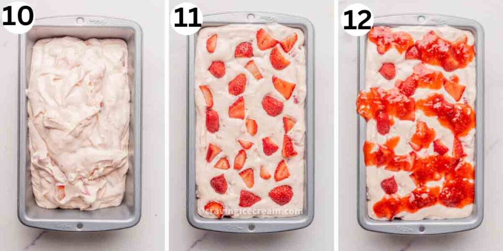 - Gently fold in half of the cooled strawberry sauce. Stir in ½ cup of quartered strawberries for added texture.