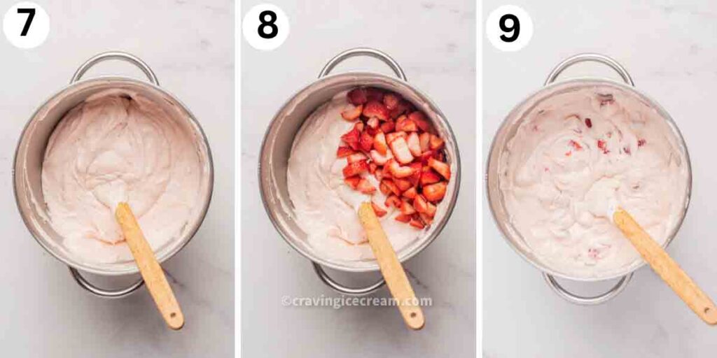 Fold in the sauce: Gently fold it to infuse flavor. Then, add ½ cup chopped strawberries for texture.