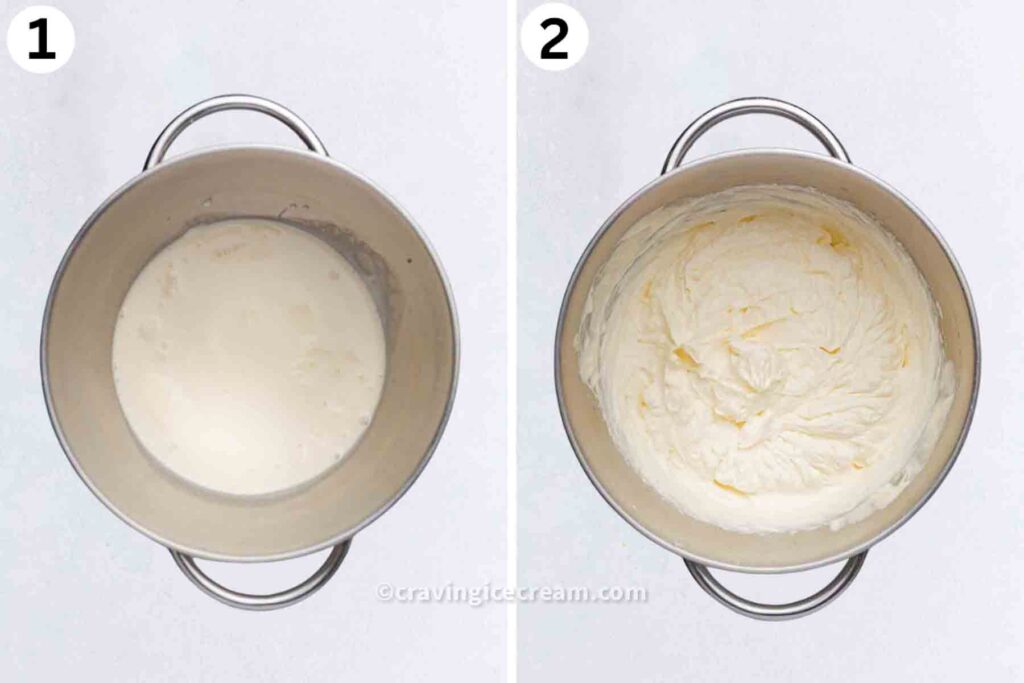 Whip the cream: In a large bowl, beat the heavy cream until it forms soft peaks. You don’t want it over-whipped, just airy and smooth.